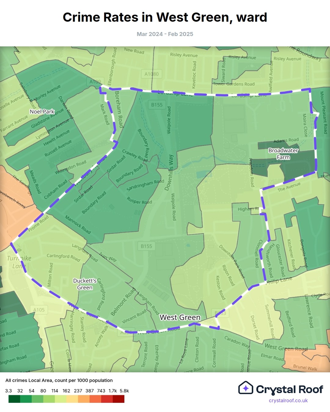 West Green, (ward) includes areas with the following crime ratings (see map):