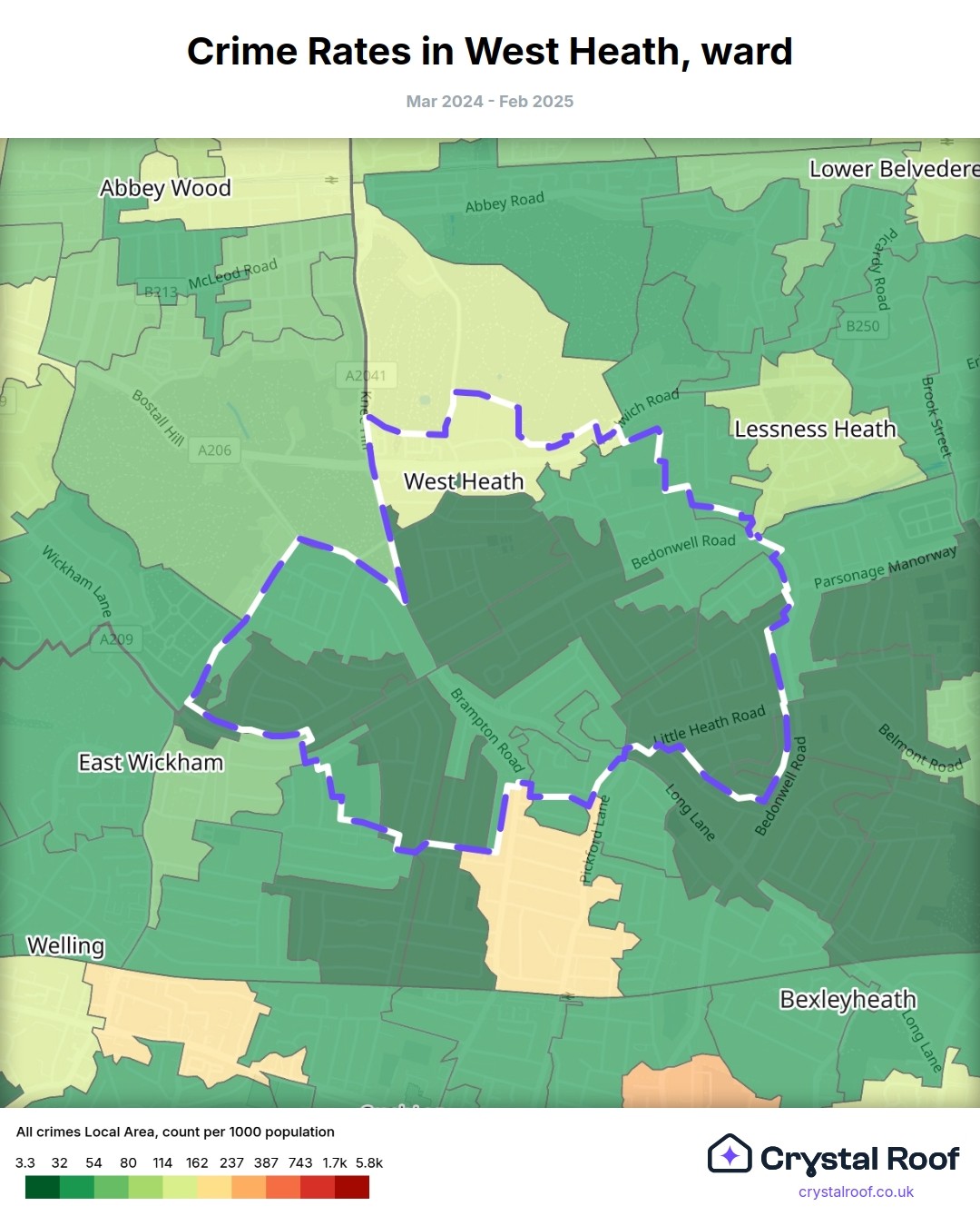 West Heath, (ward) includes areas with the following crime ratings (see map):