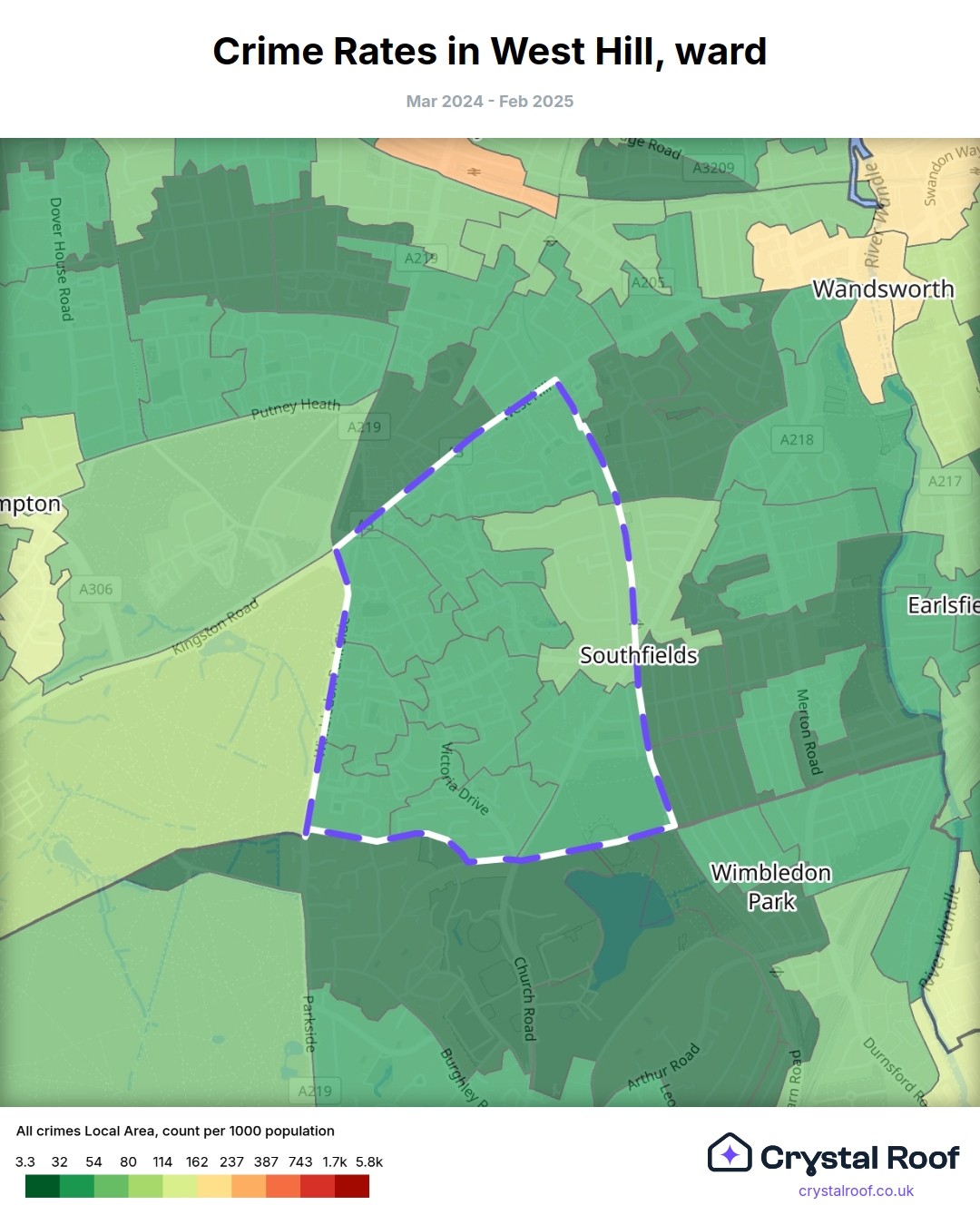 West Hill (ward) is located within Wandsworth (borough). Annual total crime rate in Wandsworth (borough) is 103 crimes per thousand resident population, which can be rated as 5 out of 10 or medium crime level compared to other local authority districts in England and Wales.