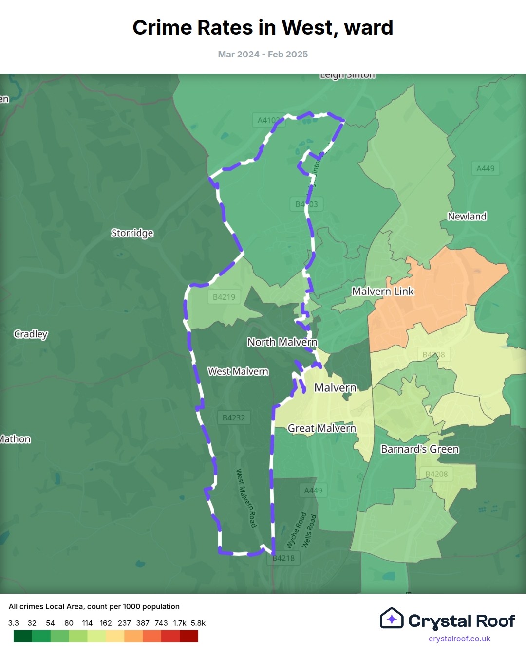 West (ward) is located within Malvern Hills (borough). Annual total crime rate in Malvern Hills (borough) is 58.3 crimes per thousand resident population, which can be rated as 2 out of 10 or low crime level compared to other local authority districts in England and Wales.