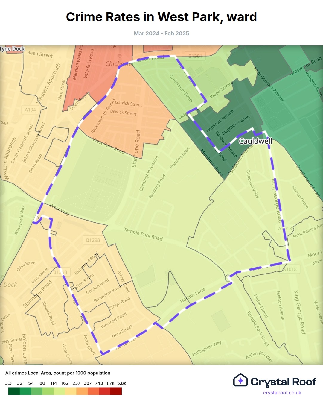 West Park (ward) is located within South Tyneside (borough). Annual total crime rate in South Tyneside (borough) is 126 crimes per thousand resident population, which can be rated as 6 out of 10 or medium crime level compared to other local authority districts in England and Wales.