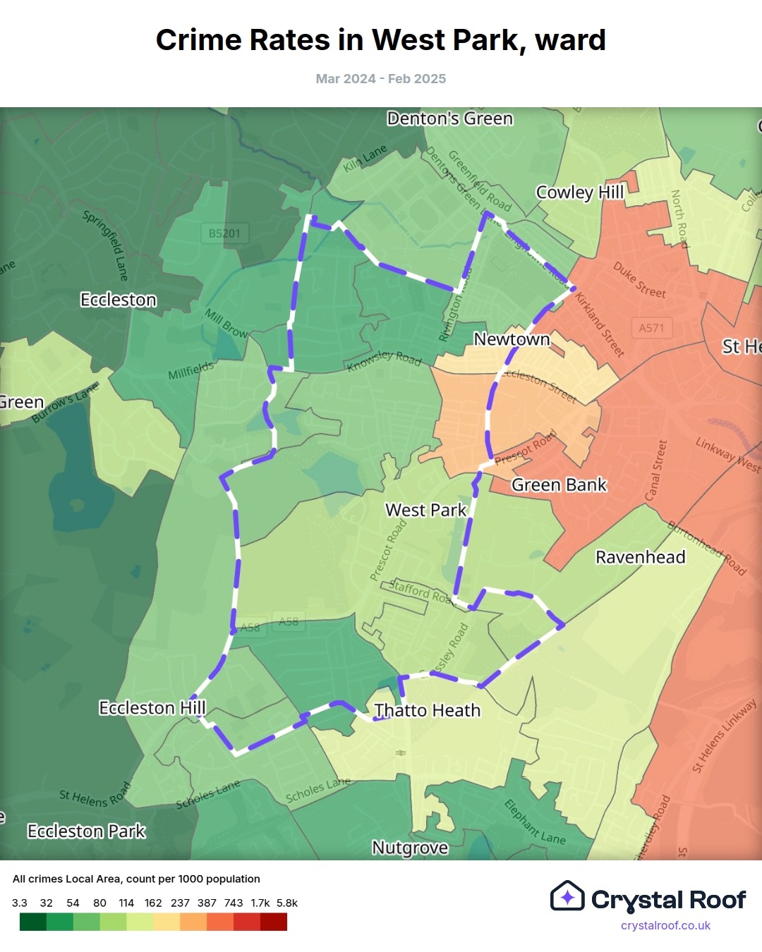 West Park (ward) is located within St. Helens (borough). Annual total crime rate in St. Helens (borough) is 98.5 crimes per thousand resident population, which can be rated as 4 out of 10 or low crime level compared to other local authority districts in England and Wales.