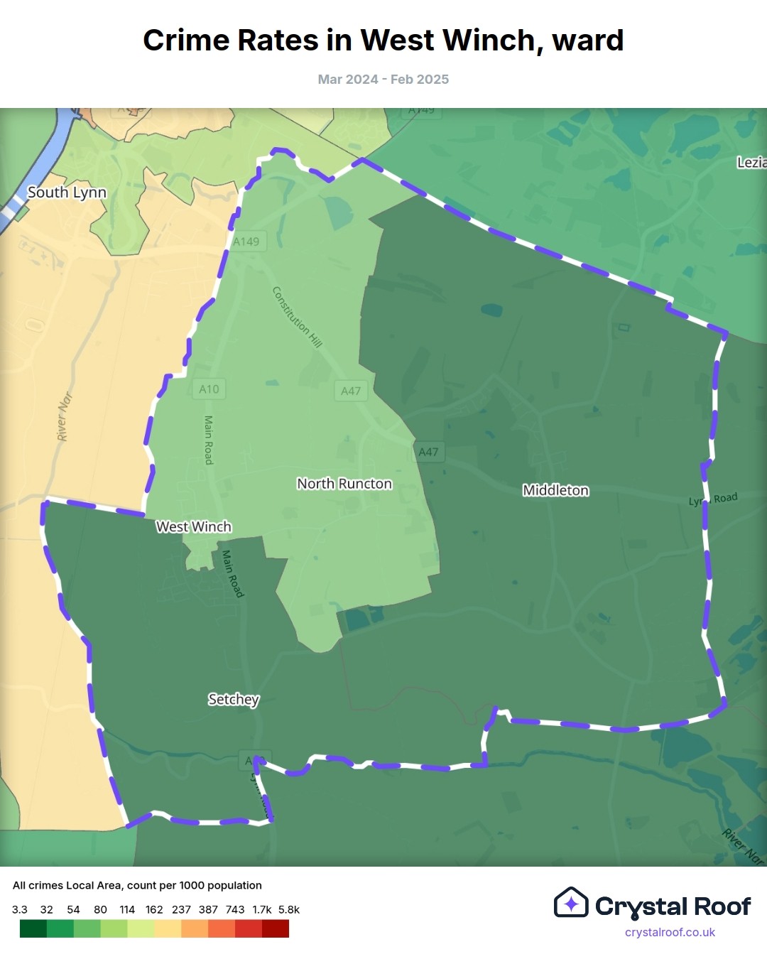 West Winch, (ward) includes areas with the following crime ratings (see map):