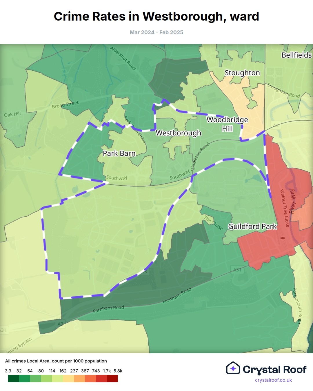 Westborough (ward) is located within Guildford (borough). Annual total crime rate in Guildford (borough) is 89.5 crimes per thousand resident population, which can be rated as 4 out of 10 or low crime level compared to other local authority districts in England and Wales.
