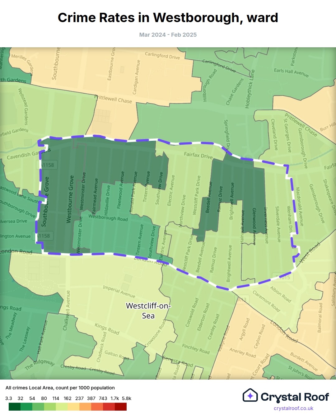 Westborough (ward) is located within Southend-on-Sea (borough). Annual total crime rate in Southend-on-Sea (borough) is 109 crimes per thousand resident population, which can be rated as 5 out of 10 or medium crime level compared to other local authority districts in England and Wales.