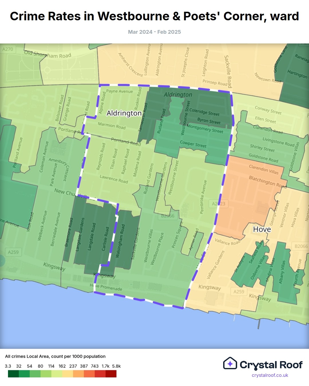 Westbourne & Poets' Corner, (ward) includes areas with the following crime ratings (see map):