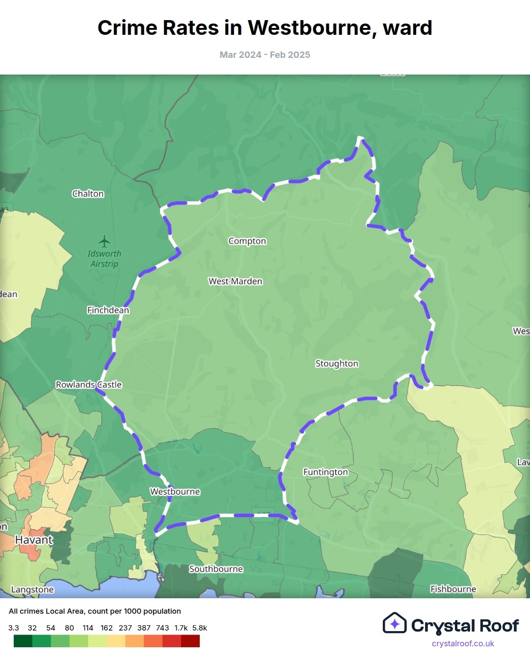 Westbourne (ward) is located within Chichester (borough). Annual total crime rate in Chichester (borough) is 74.2 crimes per thousand resident population, which can be rated as 3 out of 10 or low crime level compared to other local authority districts in England and Wales.