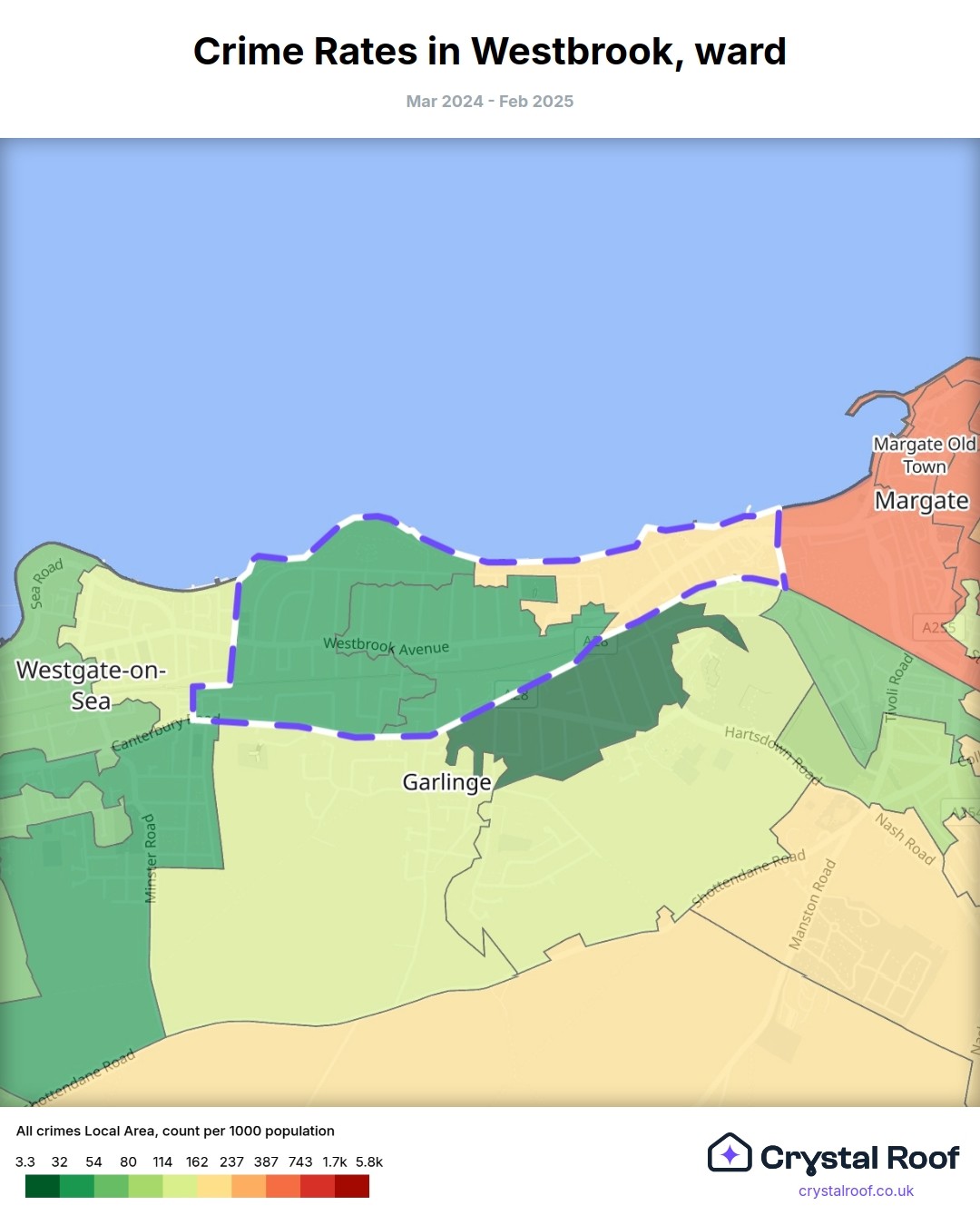 Westbrook (ward) is located within Thanet (borough). Annual total crime rate in Thanet (borough) is 121 crimes per thousand resident population, which can be rated as 6 out of 10 or medium crime level compared to other local authority districts in England and Wales.