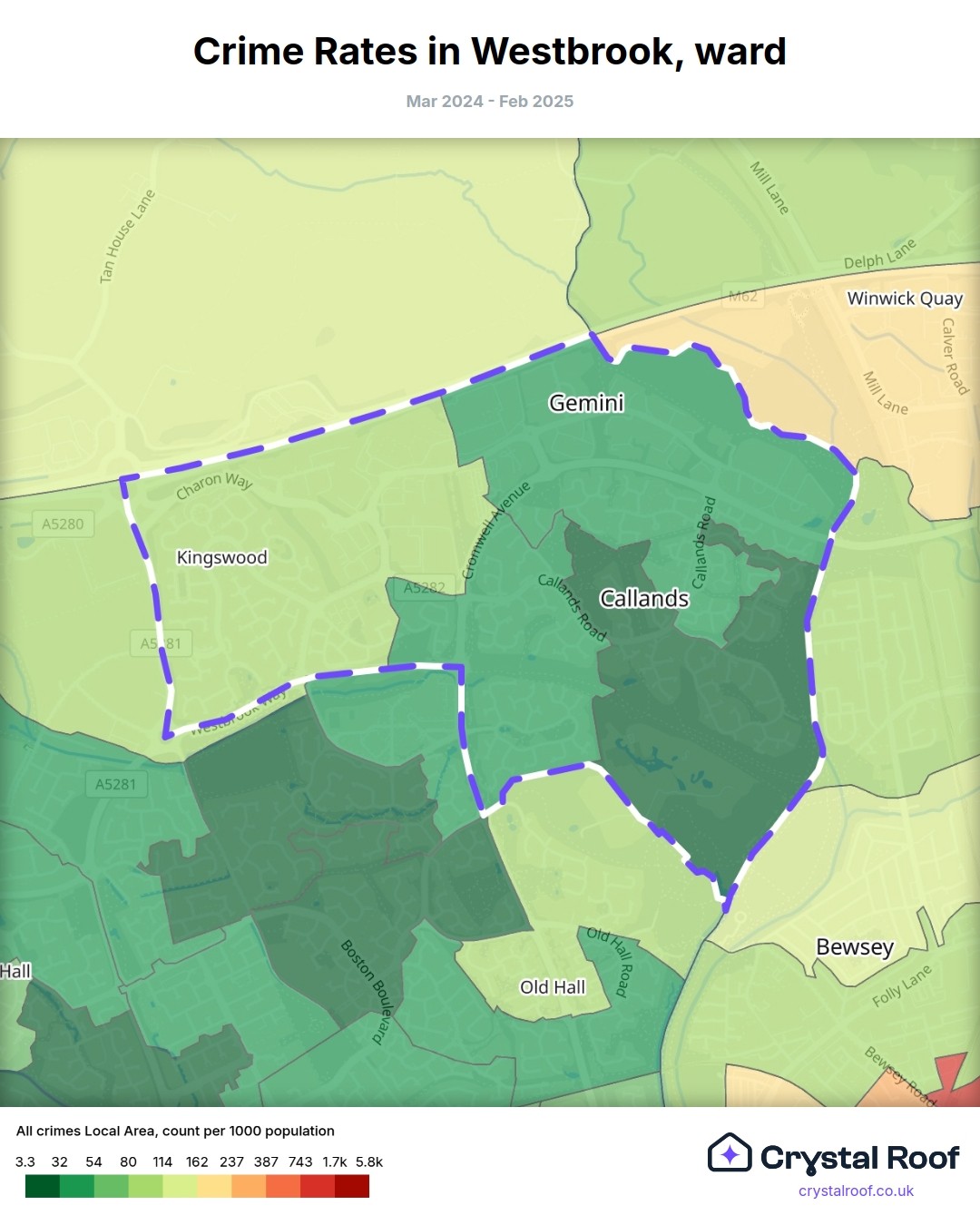 The figures in grey indicate the relative ratings of Westbrook (ward) for a specific crime type compared to other wards in England and Wales.
