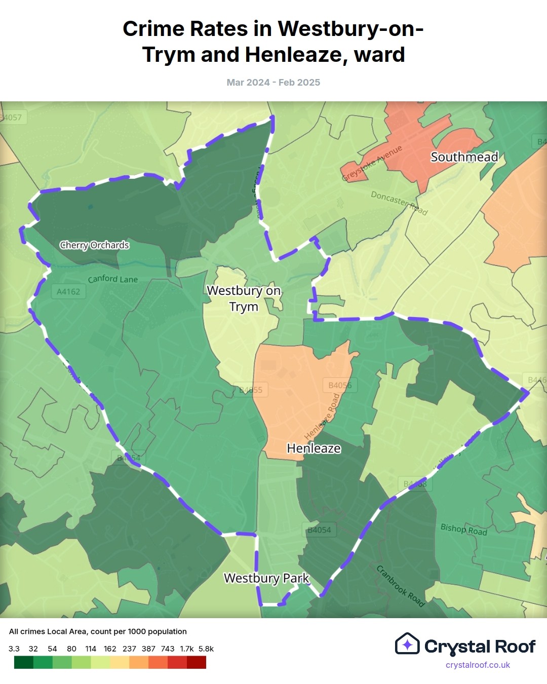 Westbury-on-Trym and Henleaze, (ward) includes areas with the following crime ratings (see map):