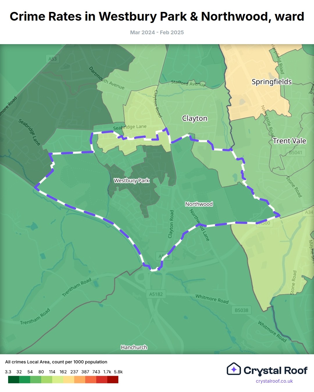 Westbury Park & Northwood (ward) is located within Newcastle-under-Lyme (borough). Annual total crime rate in Newcastle-under-Lyme (borough) is 85.1 crimes per thousand resident population, which can be rated as 3 out of 10 or low crime level compared to other local authority districts in England and Wales.