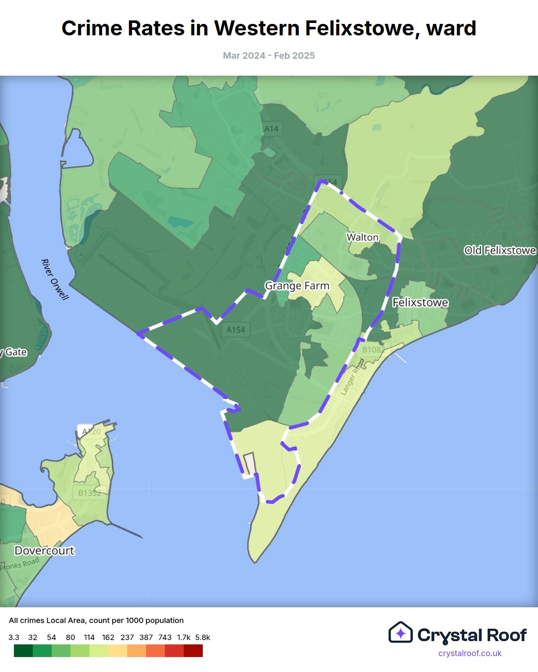 Western Felixstowe, (ward) includes areas with the following crime ratings (see map):