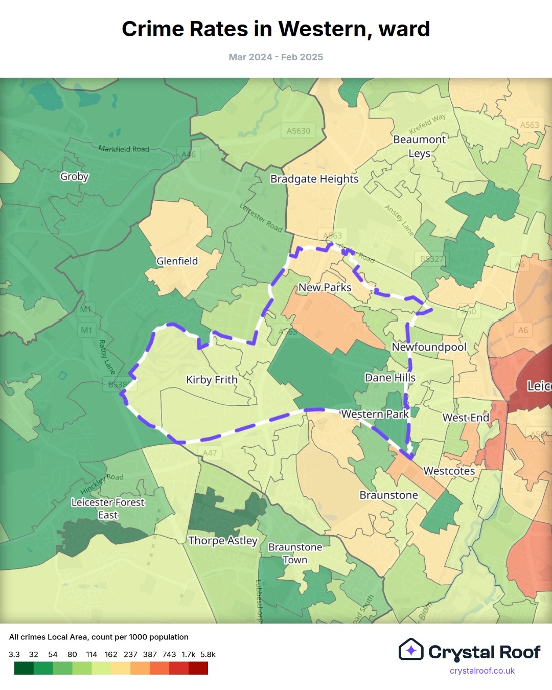 Western (ward) is located within Leicester (borough). Annual total crime rate in Leicester (borough) is 137 crimes per thousand resident population, which can be rated as 7 out of 10 or high crime level compared to other local authority districts in England and Wales.