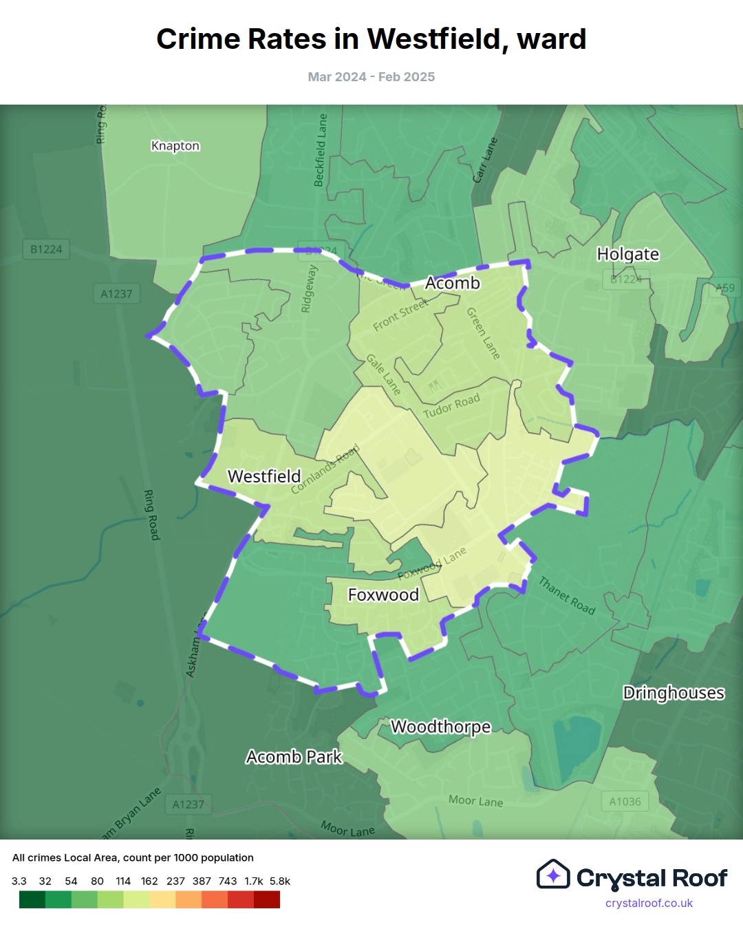 Westfield (ward) is located within York (borough). Annual total crime rate in York (borough) is 68 crimes per thousand resident population, which can be rated as 2 out of 10 or low crime level compared to other local authority districts in England and Wales.