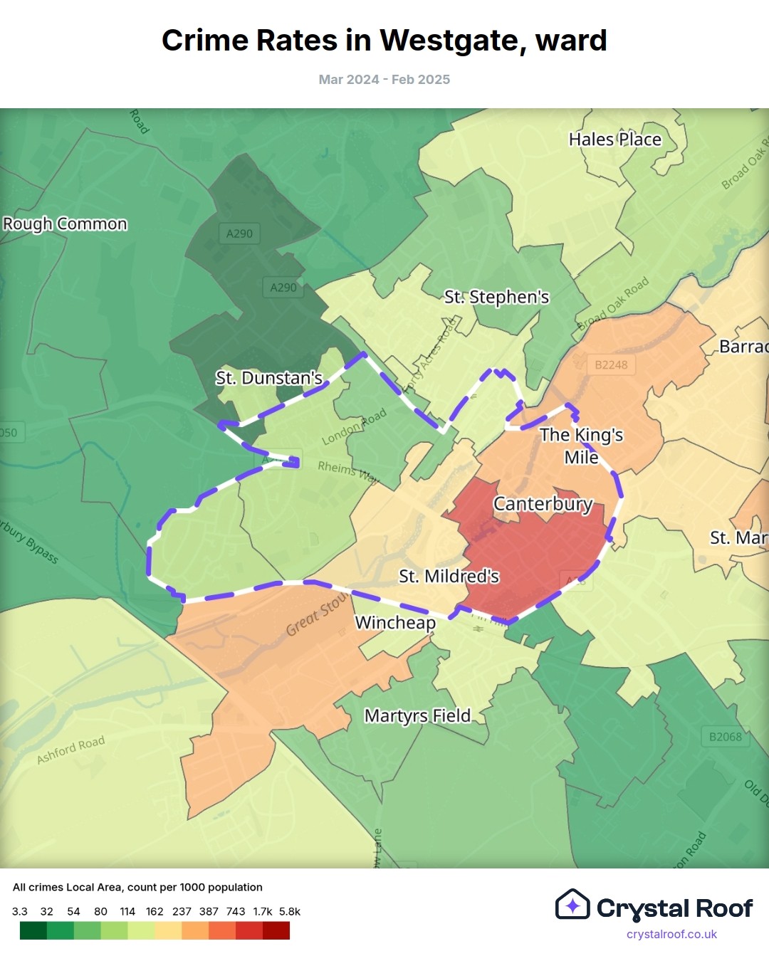 Westgate (ward) is located within Canterbury (borough). Annual total crime rate in Canterbury (borough) is 108 crimes per thousand resident population, which can be rated as 5 out of 10 or medium crime level compared to other local authority districts in England and Wales.