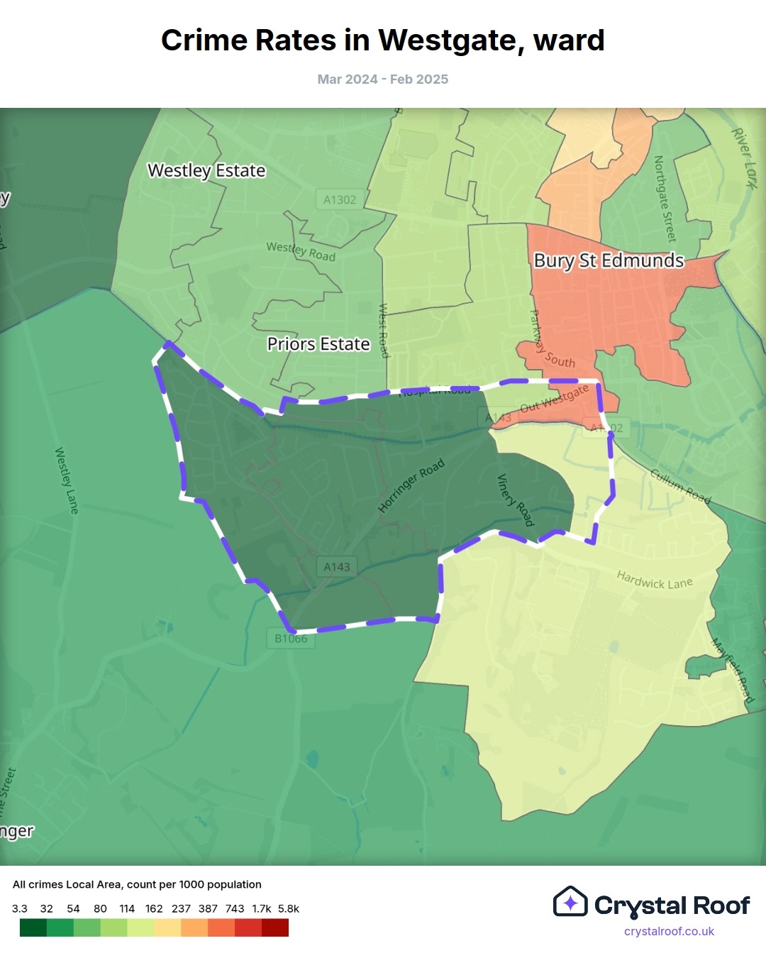 Westgate (ward) is located within West Suffolk (borough). Annual total crime rate in West Suffolk (borough) is 64 crimes per thousand resident population, which can be rated as 2 out of 10 or low crime level compared to other local authority districts in England and Wales.