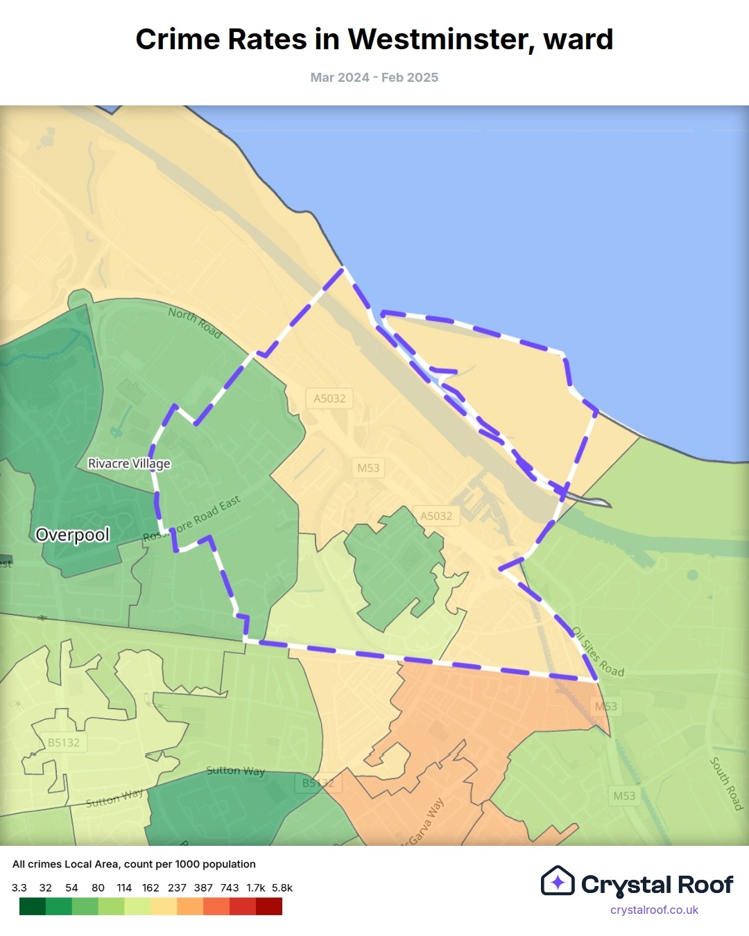 Westminster (ward) is located within Cheshire West and Chester (borough). Annual total crime rate in Cheshire West and Chester (borough) is 69.3 crimes per thousand resident population, which can be rated as 2 out of 10 or low crime level compared to other local authority districts in England and Wales.