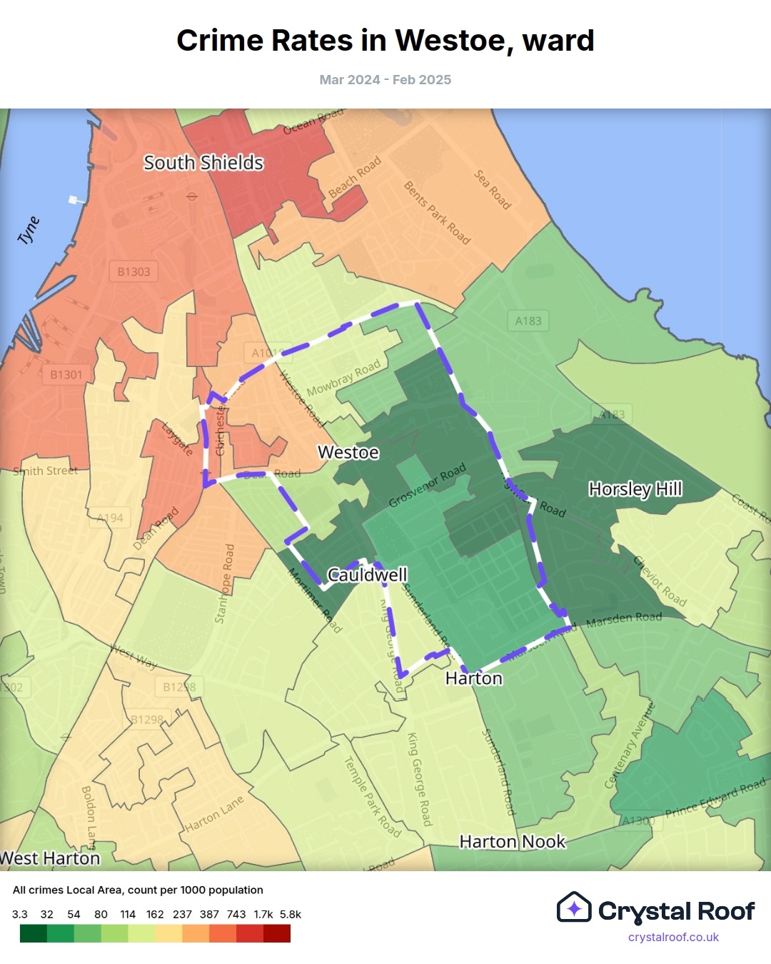 Westoe, (ward) includes areas with the following crime ratings (see map):