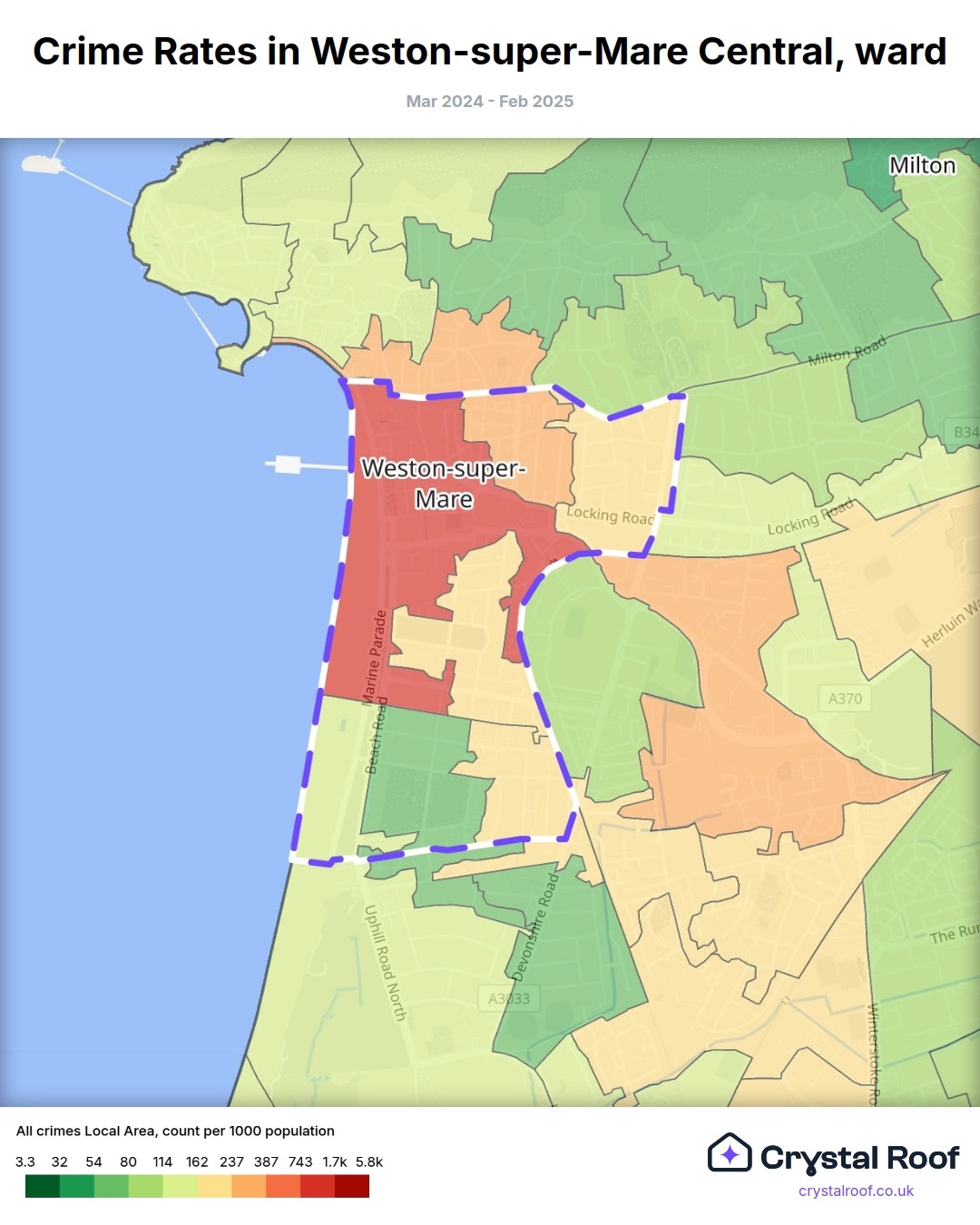 Weston-super-Mare Central, (ward) includes areas with the following crime ratings (see map):