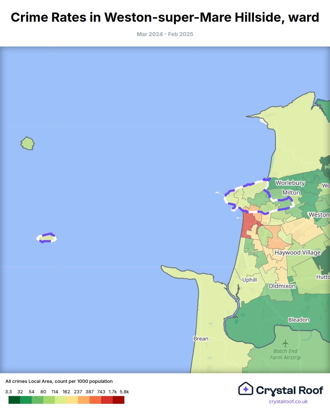 Weston-super-Mare Hillside, (ward) includes areas with the following crime ratings (see map):