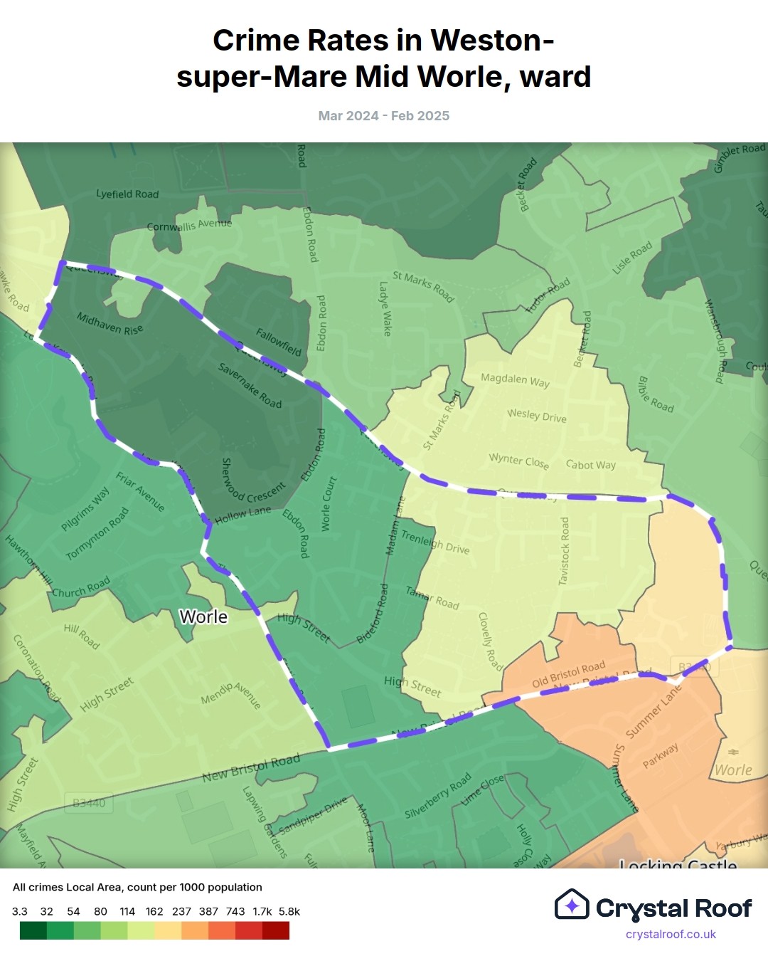 Weston-super-Mare Mid Worle, (ward) includes areas with the following crime ratings (see map):