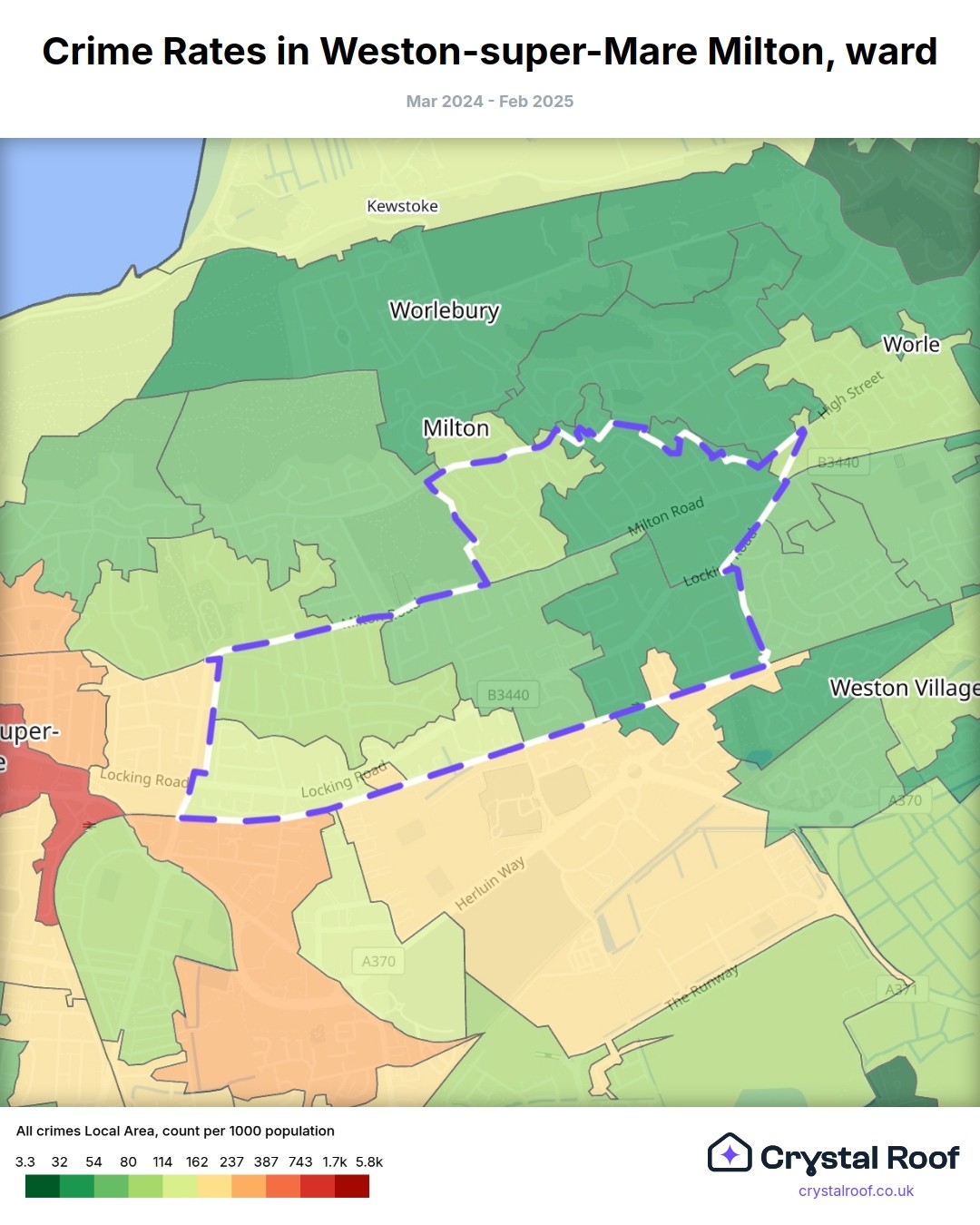 Weston-super-Mare Milton, (ward) includes areas with the following crime ratings (see map):