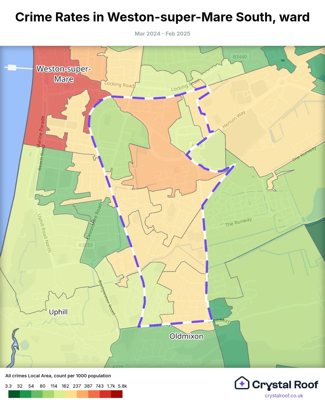 Weston-super-Mare South, (ward) includes areas with the following crime ratings (see map):