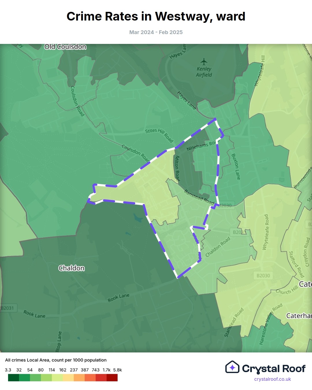 Westway (ward) is located within Tandridge (borough). Annual total crime rate in Tandridge (borough) is 70.9 crimes per thousand resident population, which can be rated as 2 out of 10 or low crime level compared to other local authority districts in England and Wales.