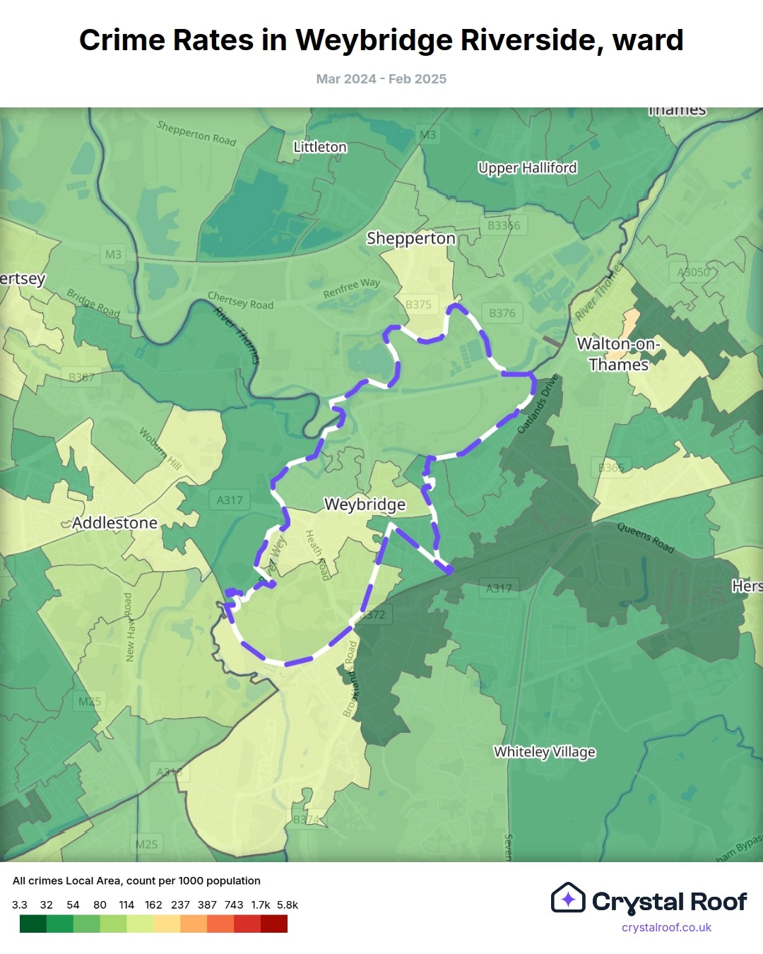 Weybridge Riverside, (ward) includes areas with the following crime ratings (see map):