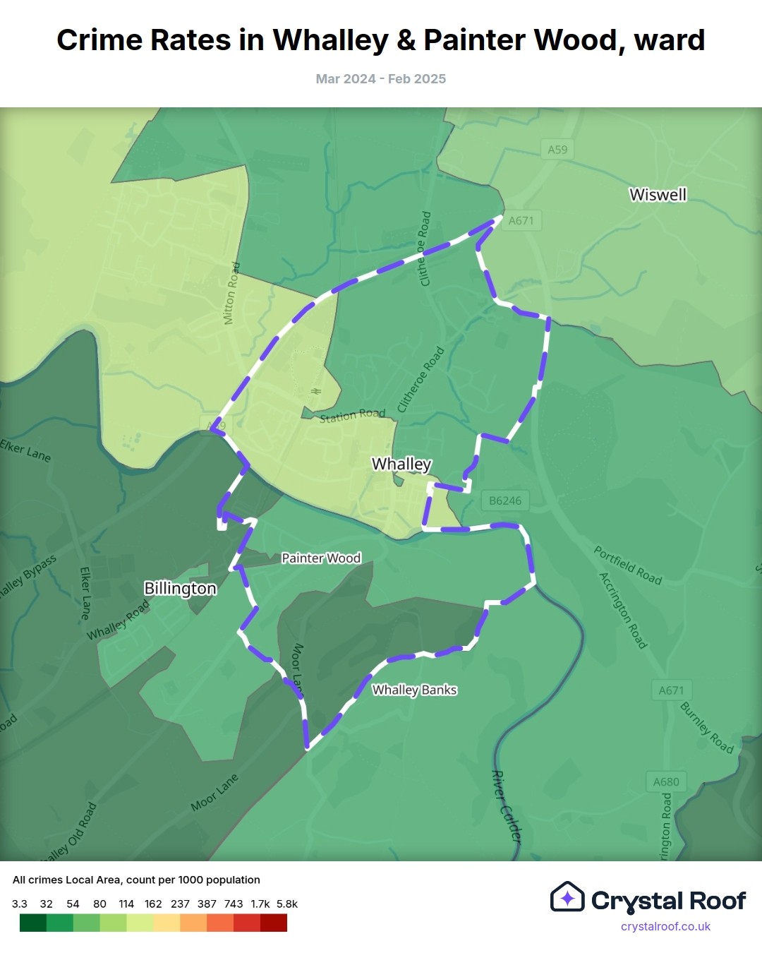 Whalley & Painter Wood, (ward) includes areas with the following crime ratings (see map):
