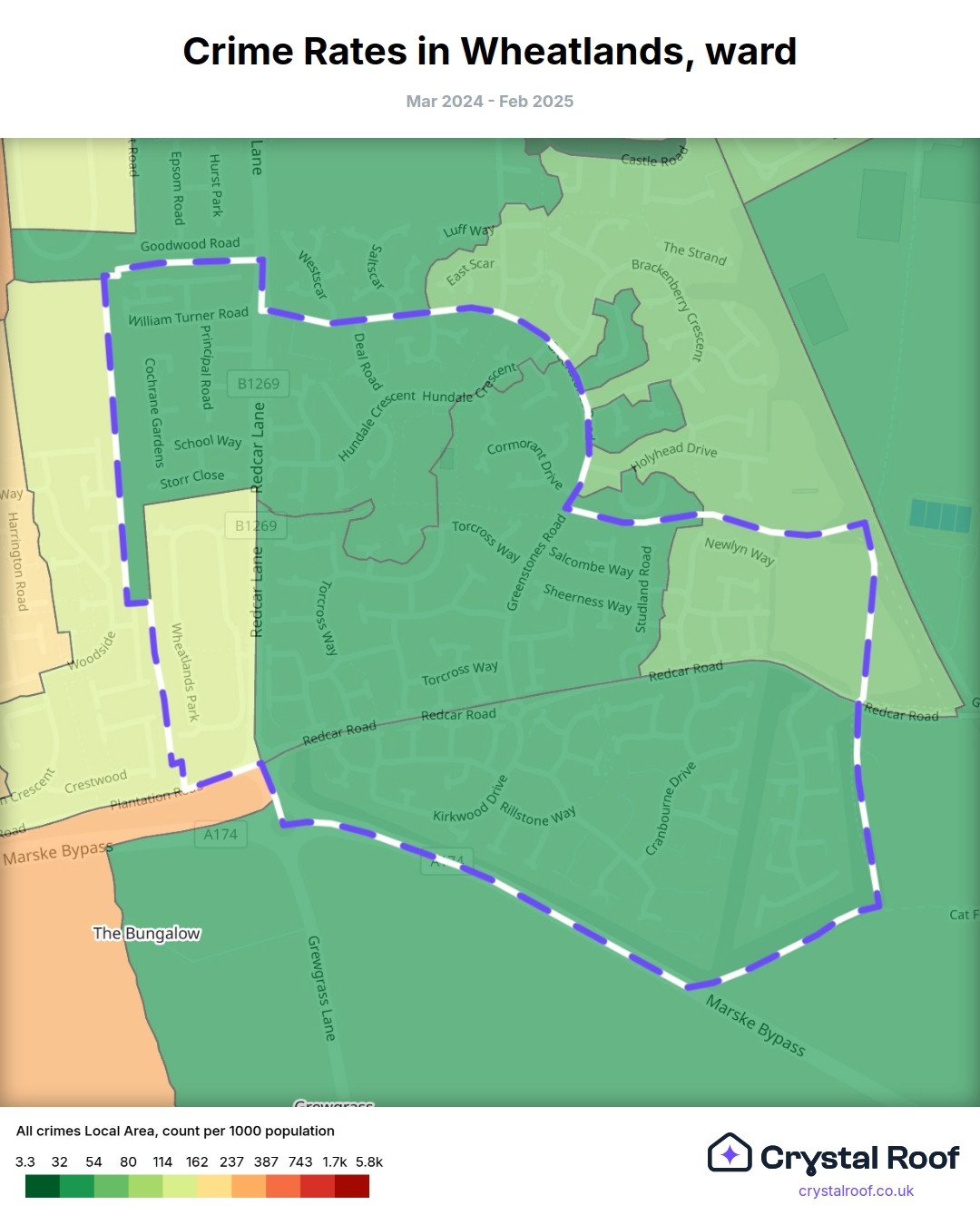 Wheatlands (ward) is located within Redcar and Cleveland (borough). Annual total crime rate in Redcar and Cleveland (borough) is 139 crimes per thousand resident population, which can be rated as 7 out of 10 or high crime level compared to other local authority districts in England and Wales.