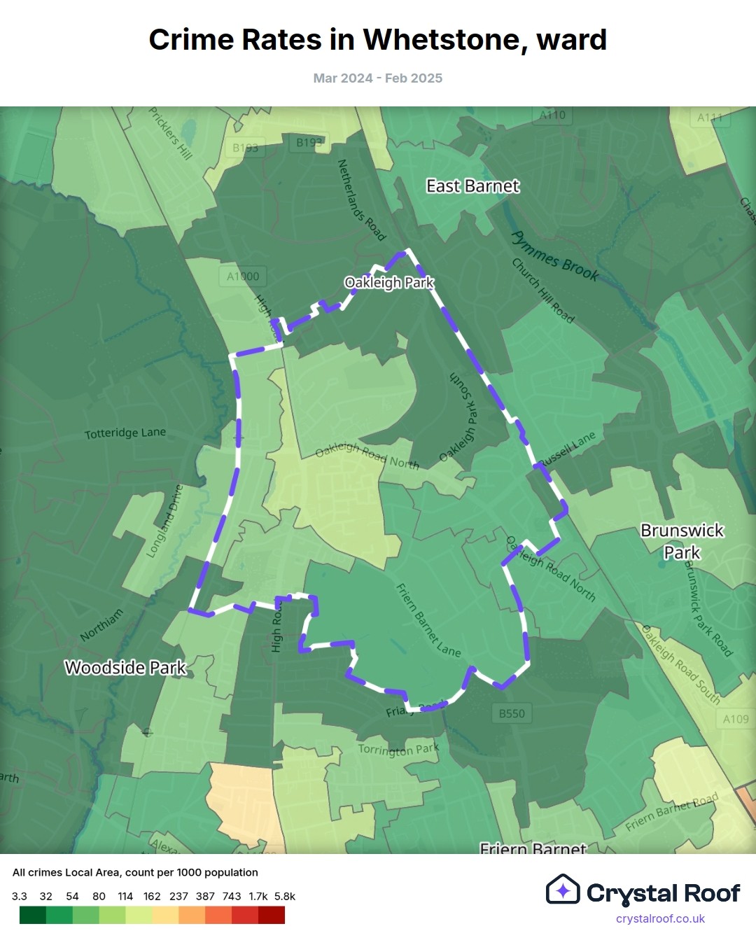 Whetstone, (ward) includes areas with the following crime ratings (see map):