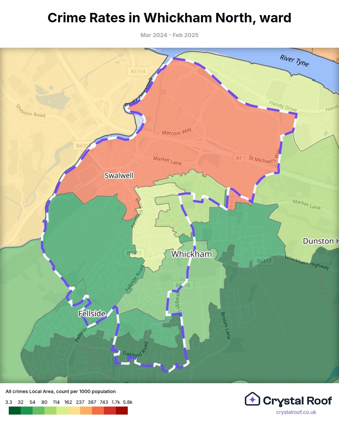 The figures in grey indicate the relative ratings of Whickham North (ward) for a specific crime type compared to other wards in England and Wales.