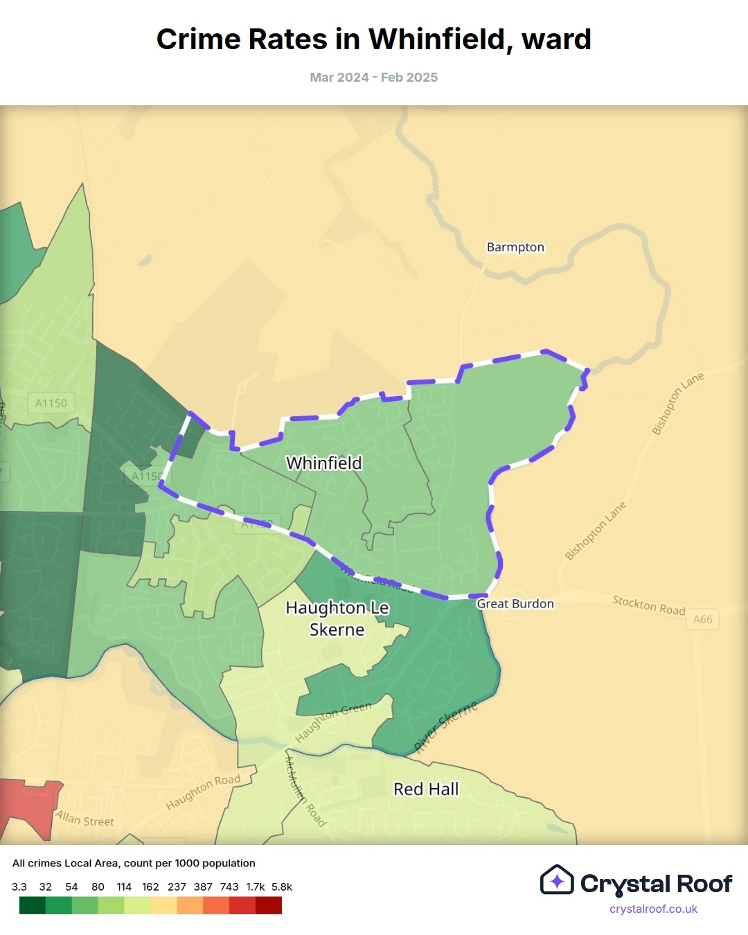 The figures in grey indicate the relative ratings of Whinfield (ward) for a specific crime type compared to other wards in England and Wales.
