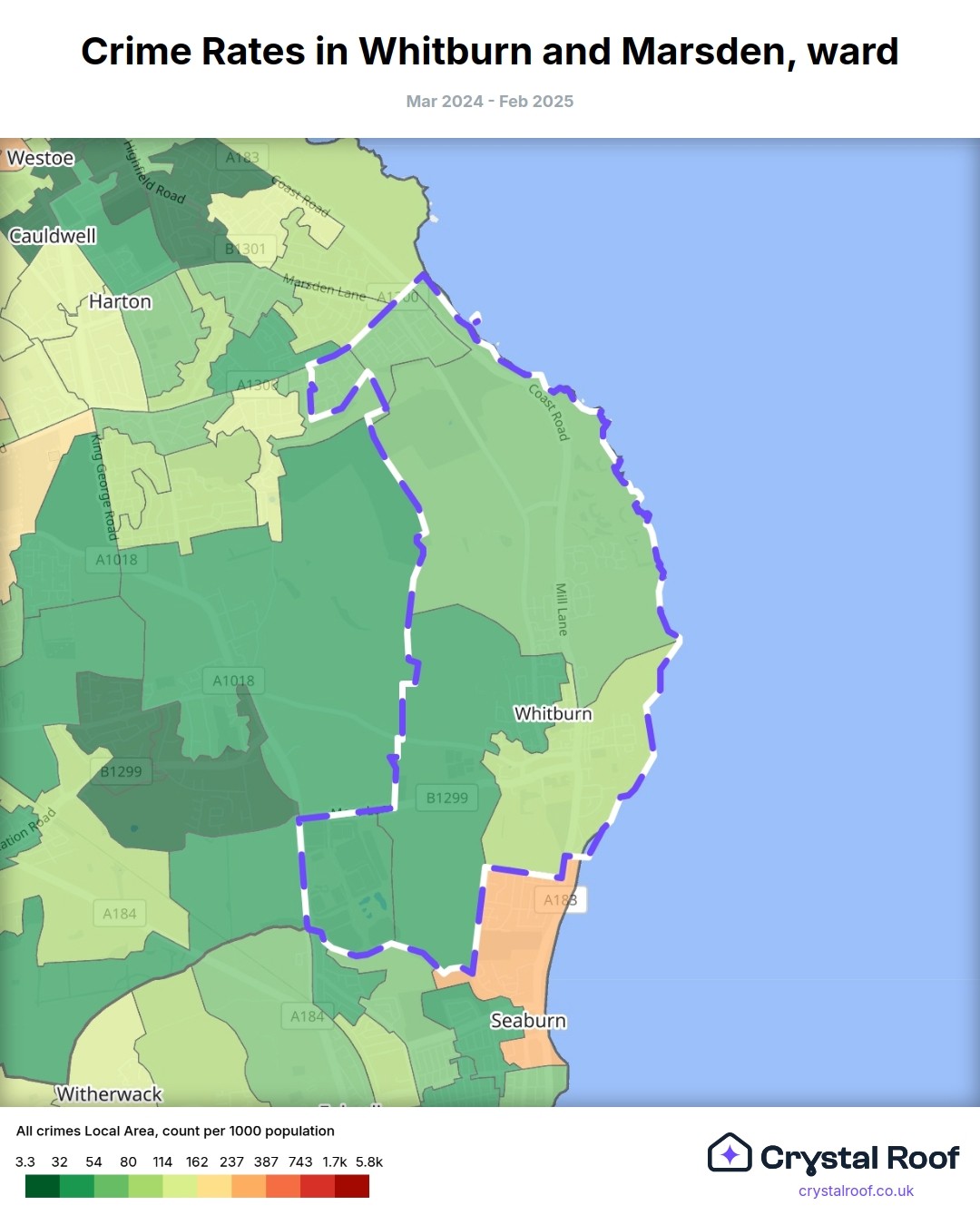 The figures in grey indicate the relative ratings of Whitburn and Marsden (ward) for a specific crime type compared to other wards in England and Wales.