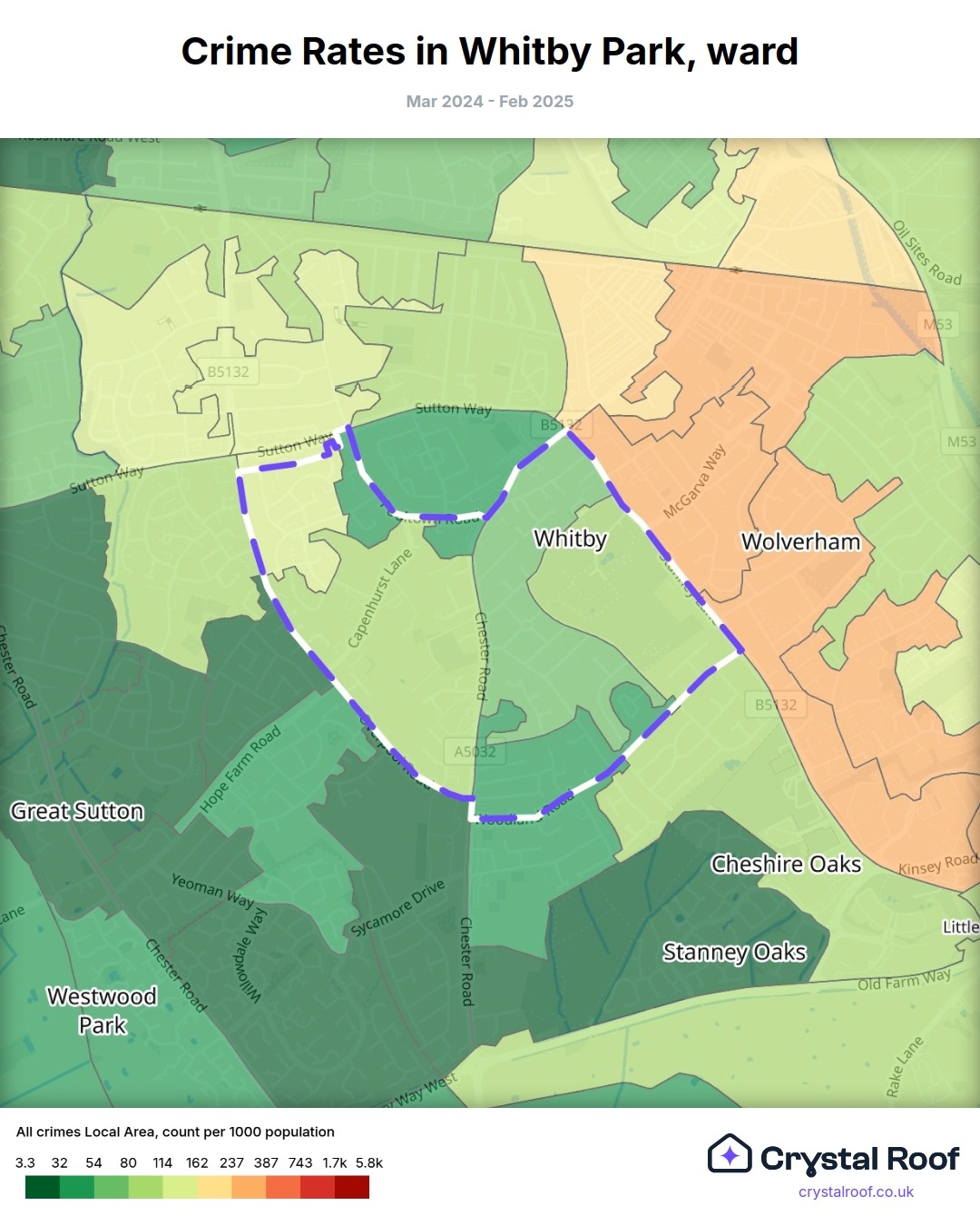 The figures in grey indicate the relative ratings of Whitby Park (ward) for a specific crime type compared to other wards in England and Wales.