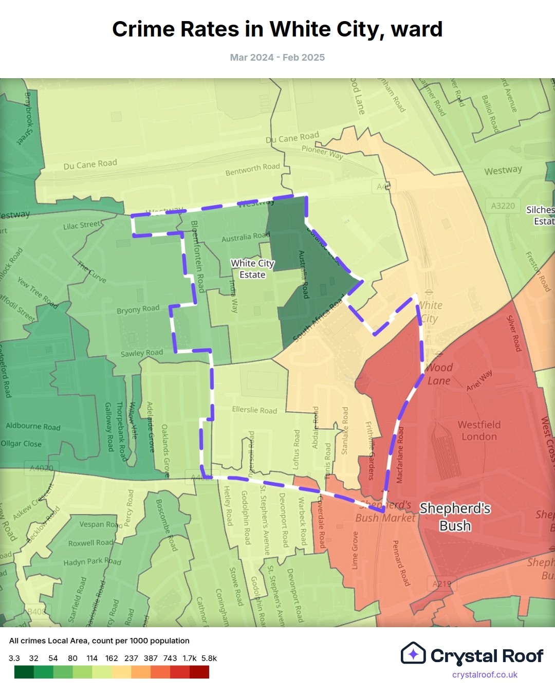 The figures in grey indicate the relative ratings of White City (ward) for a specific crime type compared to other wards in England and Wales.