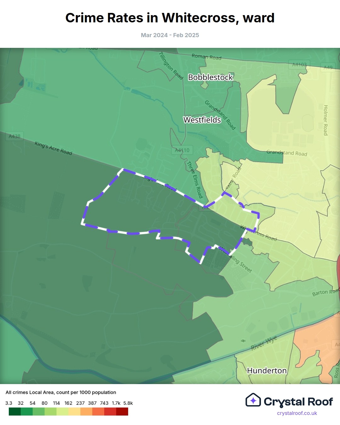 Whitecross (ward) is located within Herefordshire, County of (borough). Annual total crime rate in Herefordshire, County of (borough) is 63.5 crimes per thousand resident population, which can be rated as 2 out of 10 or low crime level compared to other local authority districts in England and Wales.