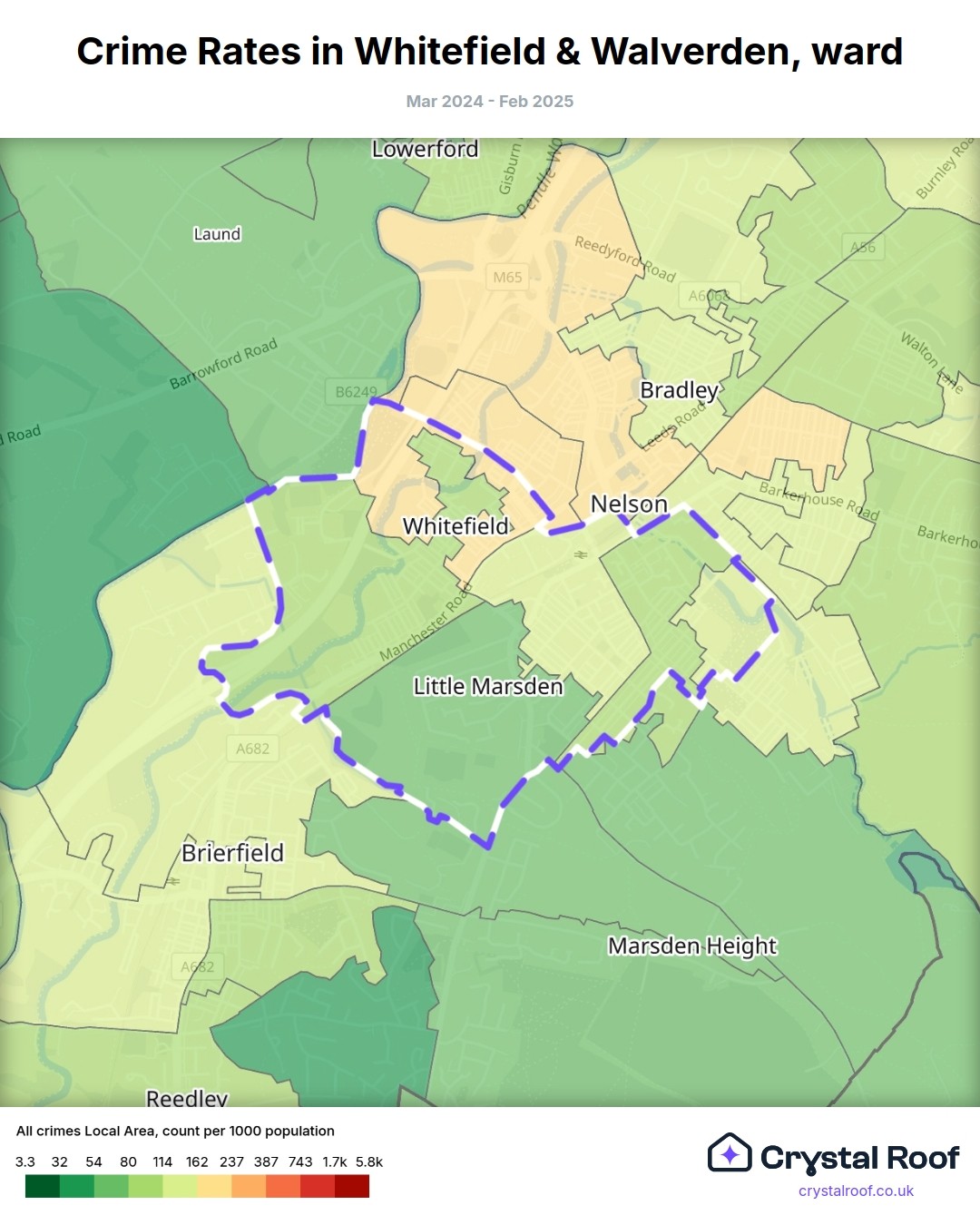 Whitefield & Walverden, (ward) includes areas with the following crime ratings (see map):