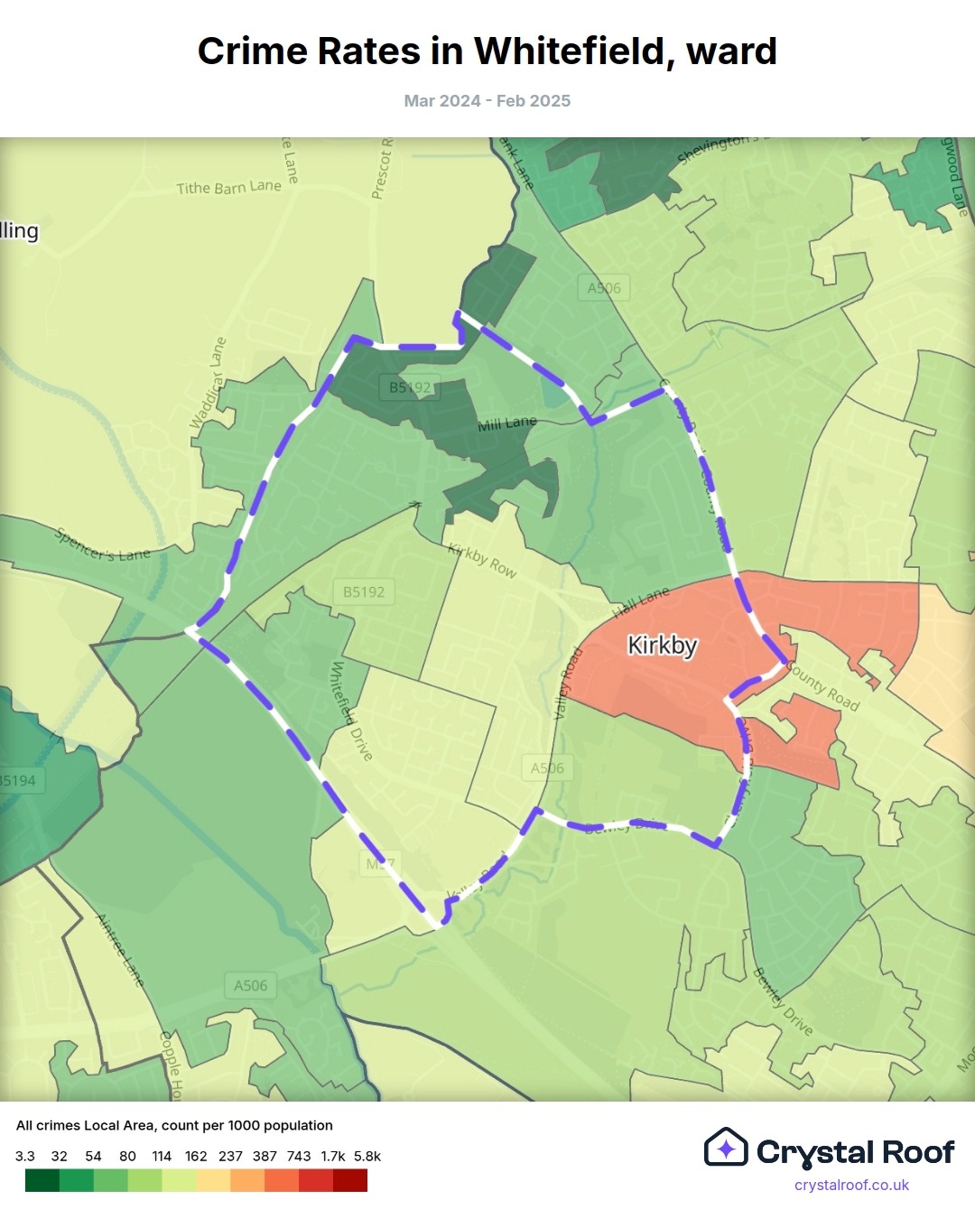 Whitefield (ward) is located within Knowsley (borough). Annual total crime rate in Knowsley (borough) is 98.3 crimes per thousand resident population, which can be rated as 4 out of 10 or low crime level compared to other local authority districts in England and Wales.