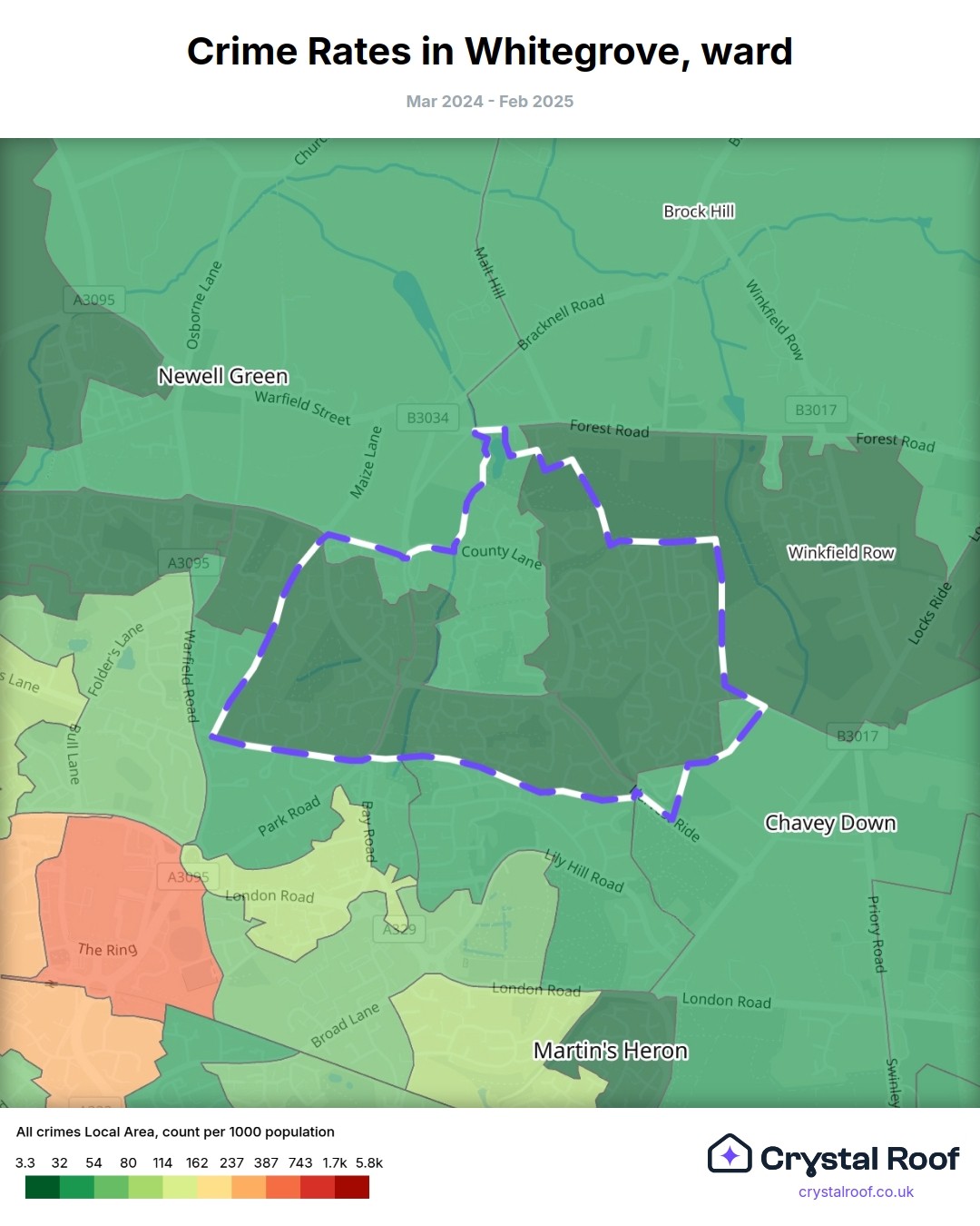 Whitegrove (ward) is located within Bracknell Forest (borough). Annual total crime rate in Bracknell Forest (borough) is 68.3 crimes per thousand resident population, which can be rated as 2 out of 10 or low crime level compared to other local authority districts in England and Wales.