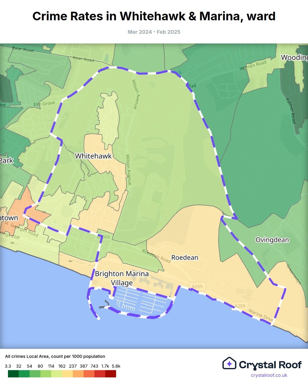 Whitehawk & Marina, (ward) includes areas with the following crime ratings (see map):