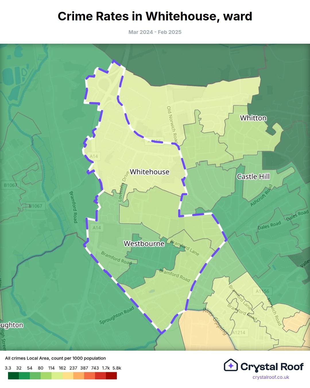 Whitehouse (ward) is located within Ipswich (borough). Annual total crime rate in Ipswich (borough) is 96.1 crimes per thousand resident population, which can be rated as 4 out of 10 or low crime level compared to other local authority districts in England and Wales.