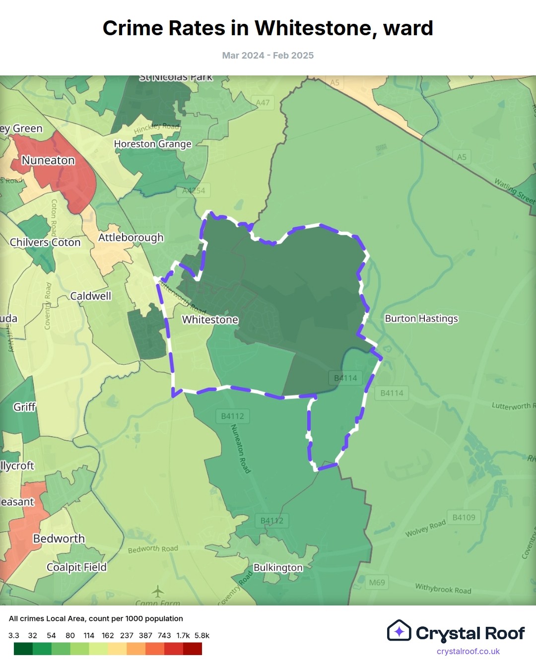 Whitestone (ward) is located within Nuneaton and Bedworth (borough). Annual total crime rate in Nuneaton and Bedworth (borough) is 110 crimes per thousand resident population, which can be rated as 5 out of 10 or medium crime level compared to other local authority districts in England and Wales.