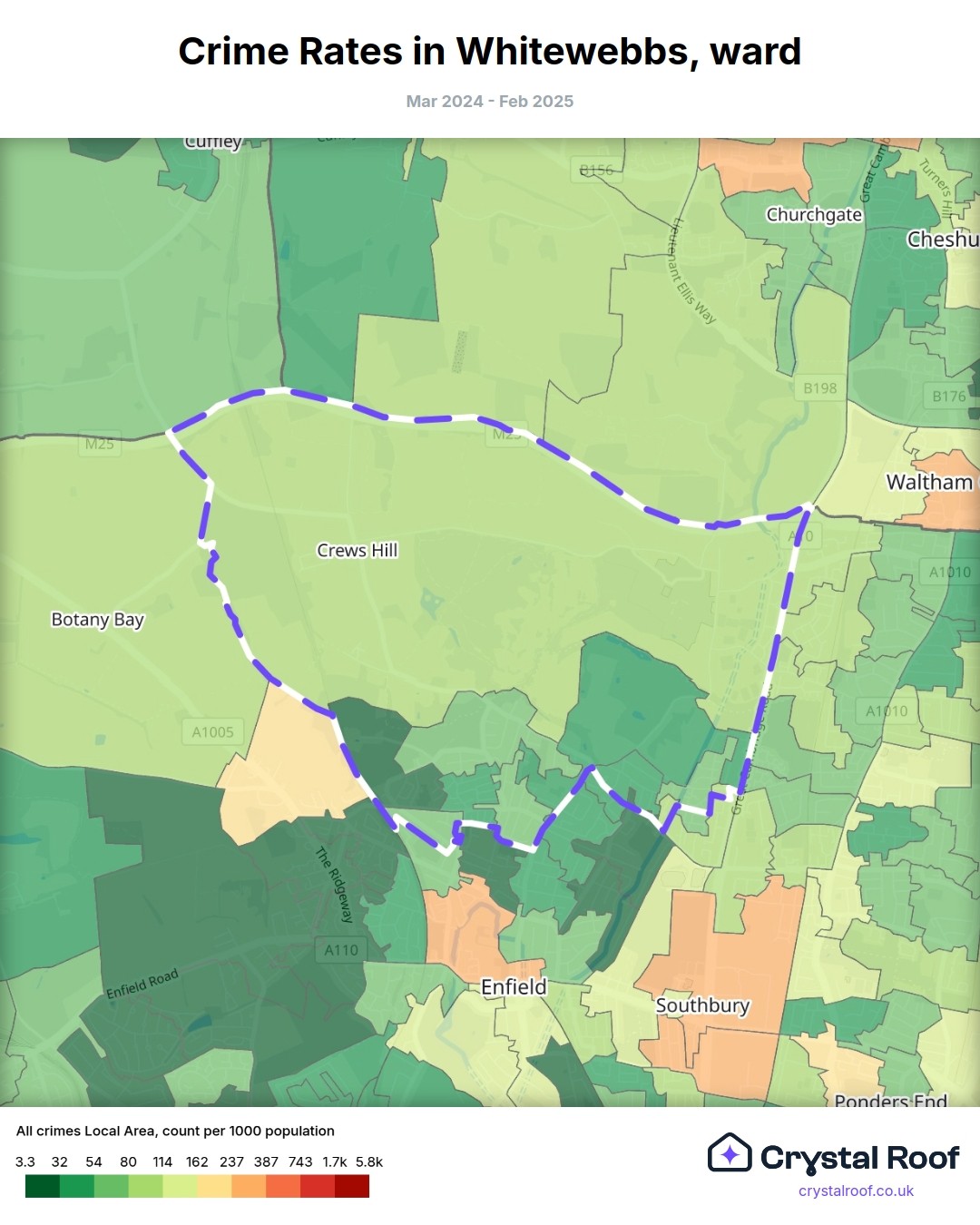 Whitewebbs (ward) is located within Enfield (borough). Annual total crime rate in Enfield (borough) is 113 crimes per thousand resident population, which can be rated as 5 out of 10 or medium crime level compared to other local authority districts in England and Wales.