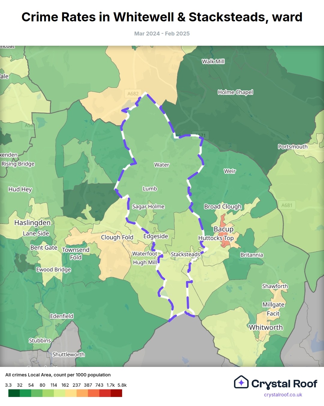 Whitewell & Stacksteads, (ward) includes areas with the following crime ratings (see map):