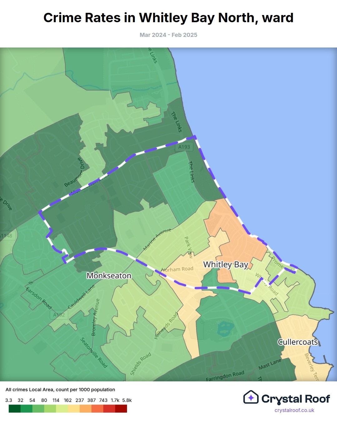 Whitley Bay North, (ward) includes areas with the following crime ratings (see map):