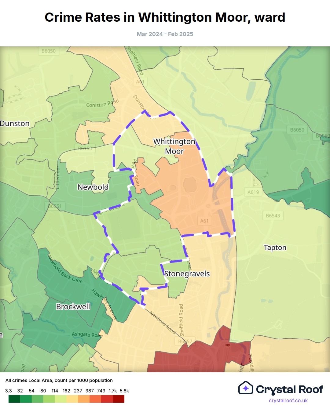 Whittington Moor, (ward) includes areas with the following crime ratings (see map):