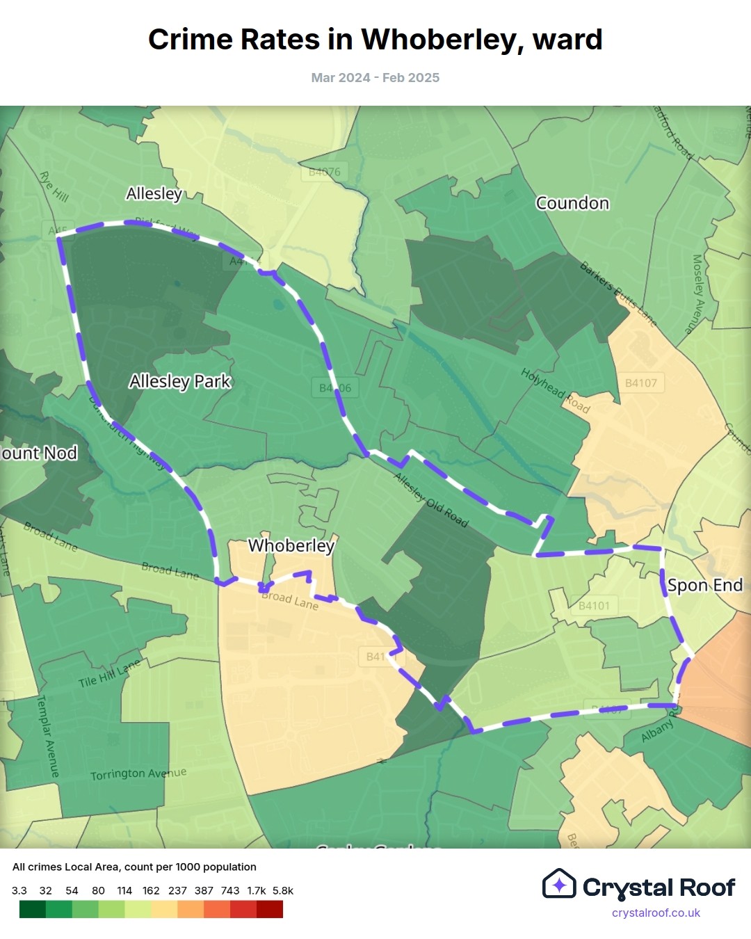 Whoberley (ward) is located within Coventry (borough). Annual total crime rate in Coventry (borough) is 108 crimes per thousand resident population, which can be rated as 5 out of 10 or medium crime level compared to other local authority districts in England and Wales.