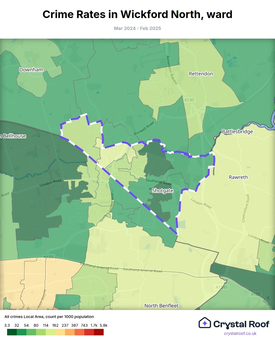 Wickford North, (ward) includes areas with the following crime ratings (see map):